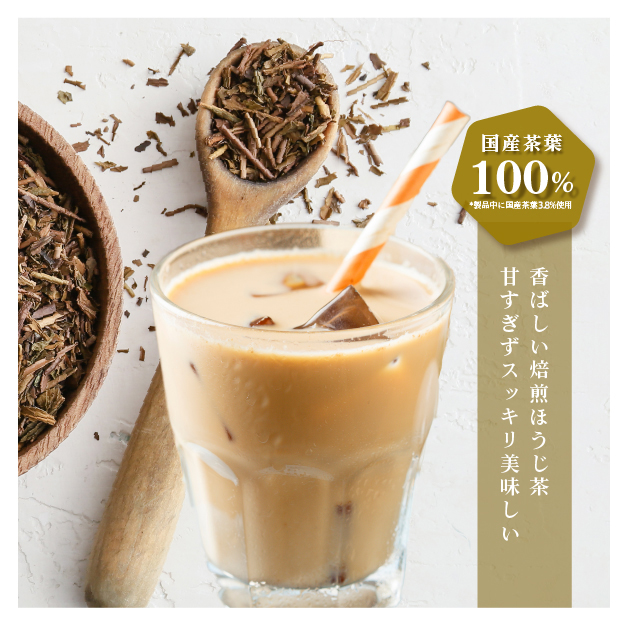 国産茶葉100%使用しました!(製品中3.8%使用)香ばしい焙煎ほうじ茶とラテのまろやかさがベストマッチ!甘さ超控えめのスッキリとした飲み心地です。